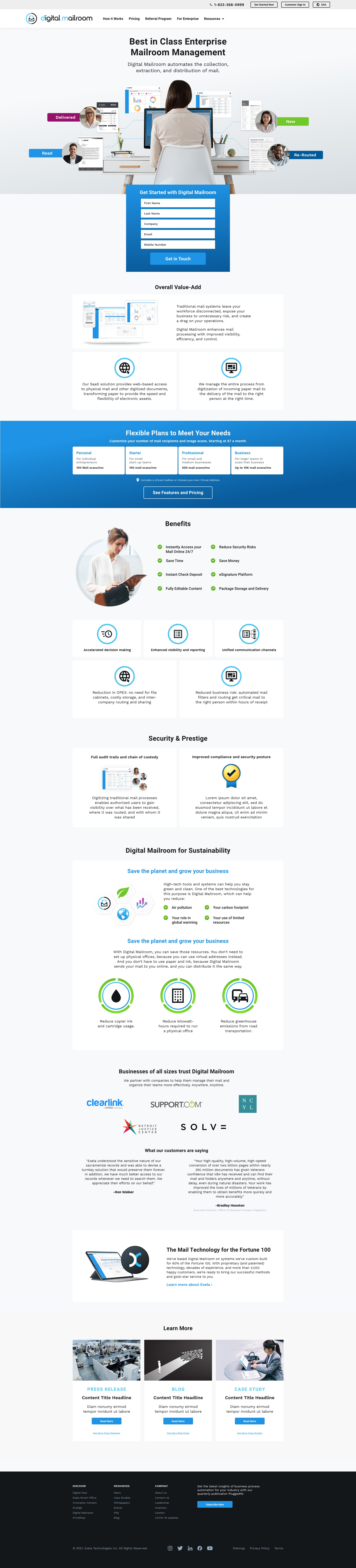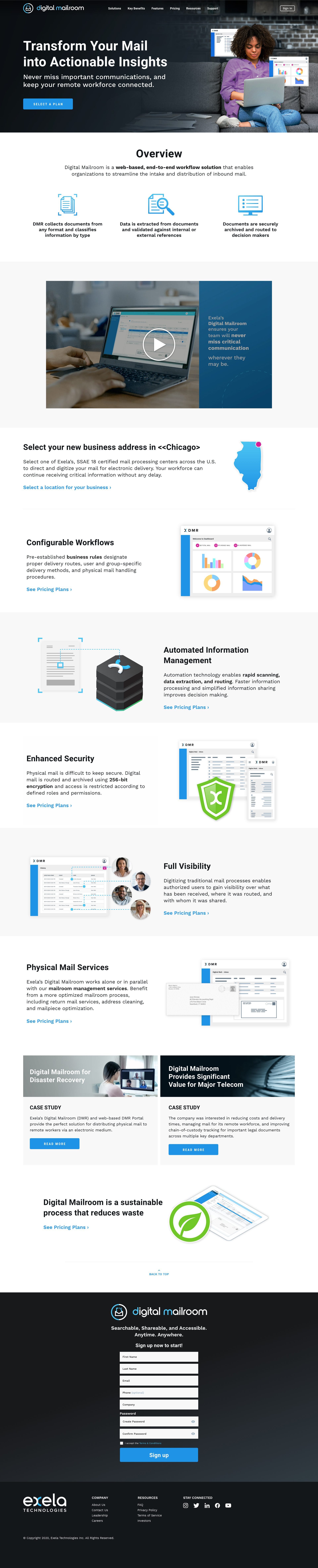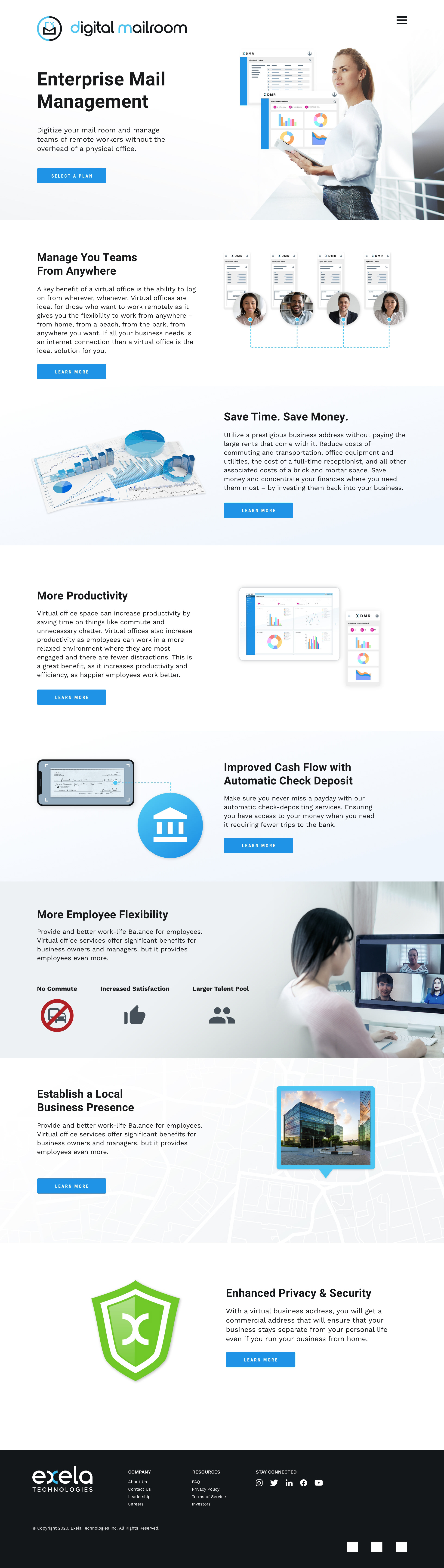 Concept layouts for Exela’s Digital Mailroom product, designed to clearly communicate key benefits and explain functionality through clean, user-focused visuals.
