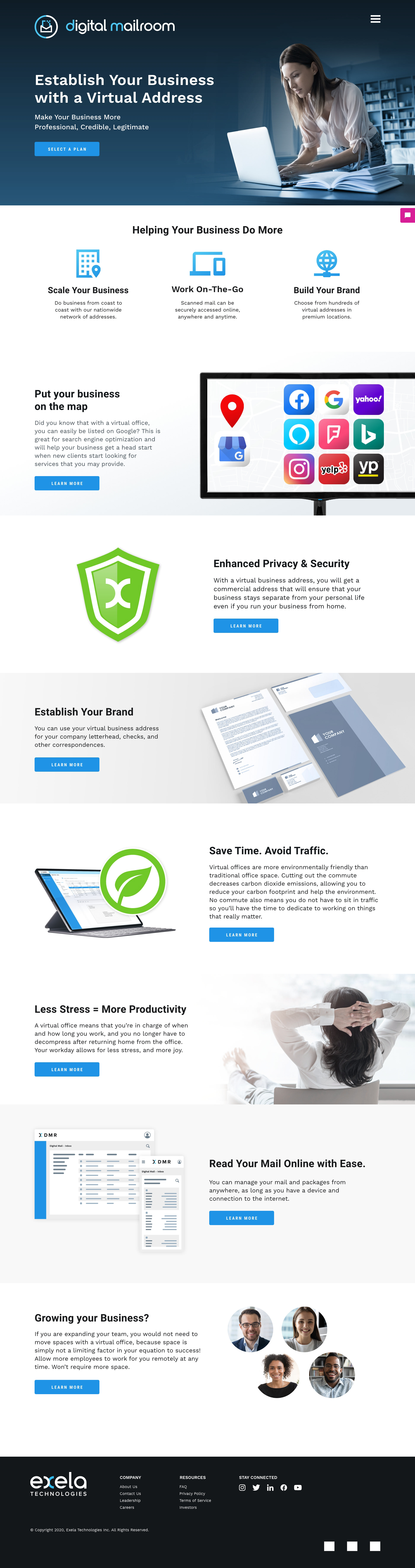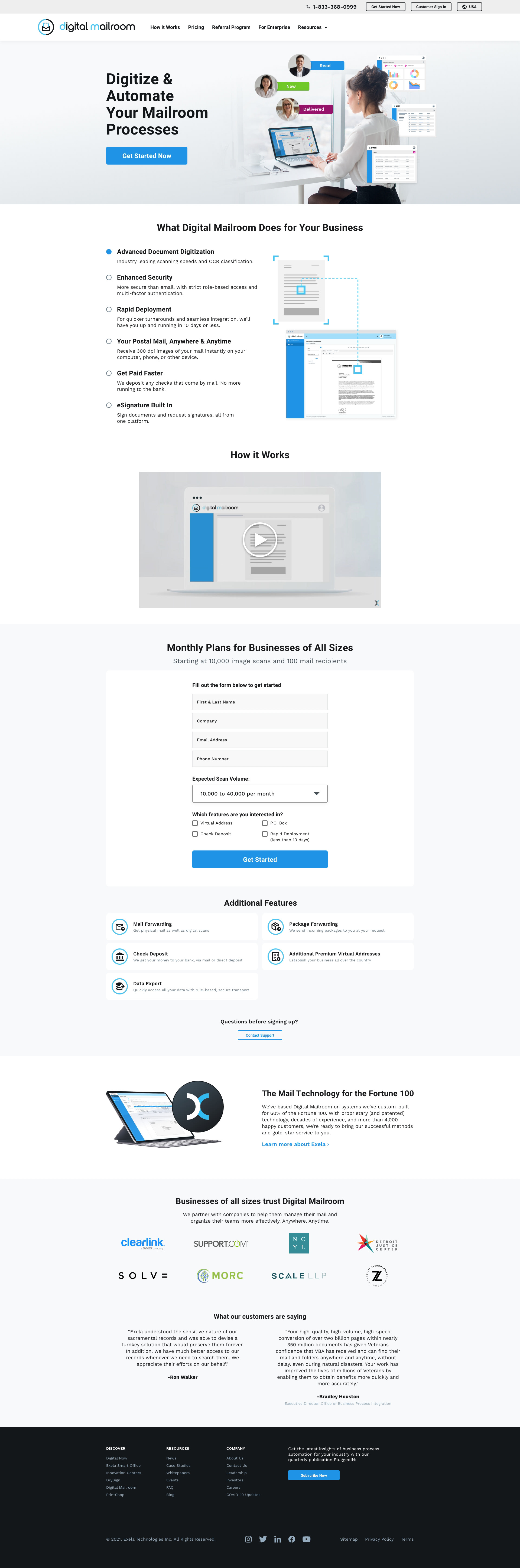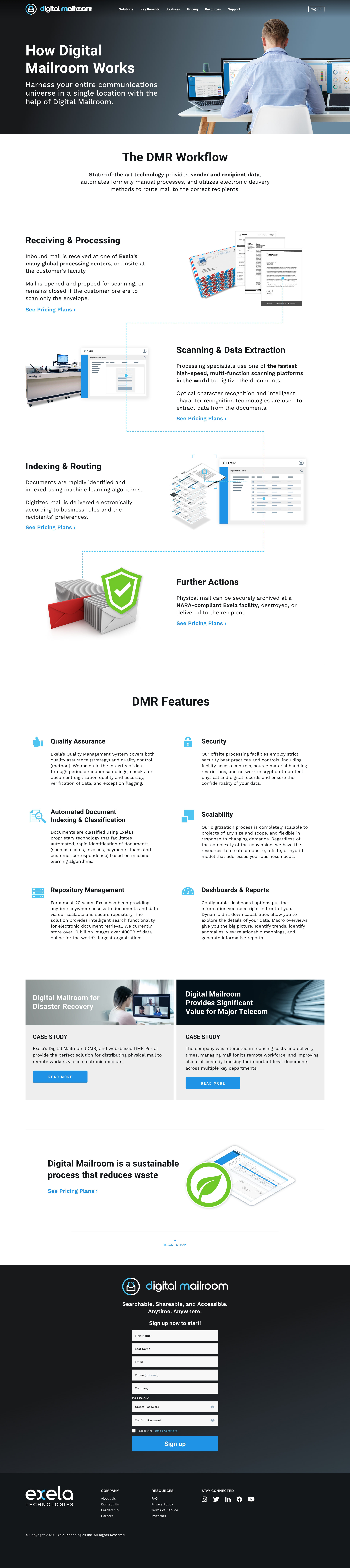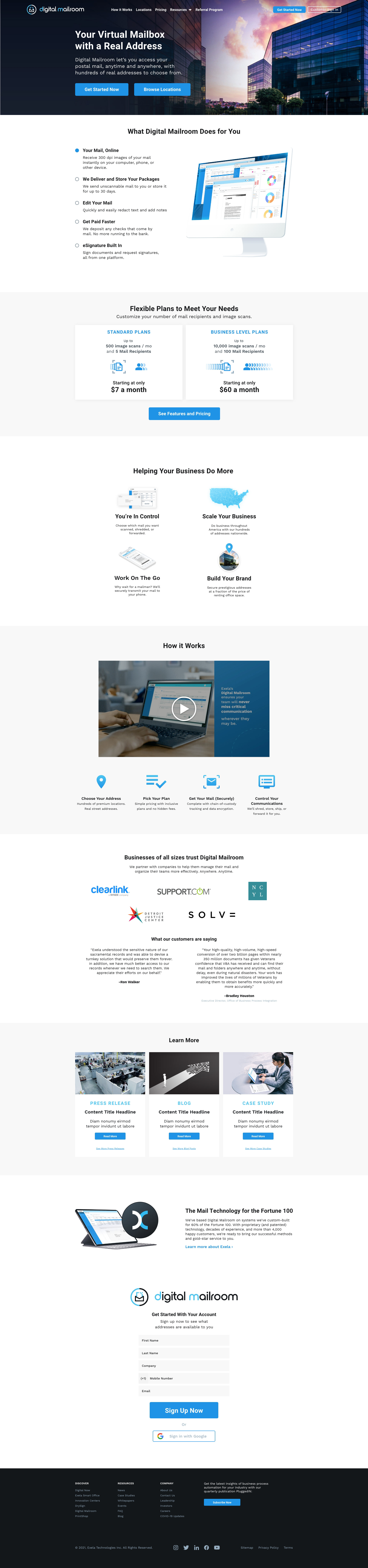 Concept layouts for Exela’s Digital Mailroom product, designed to clearly communicate key benefits and explain functionality through clean, user-focused visuals.